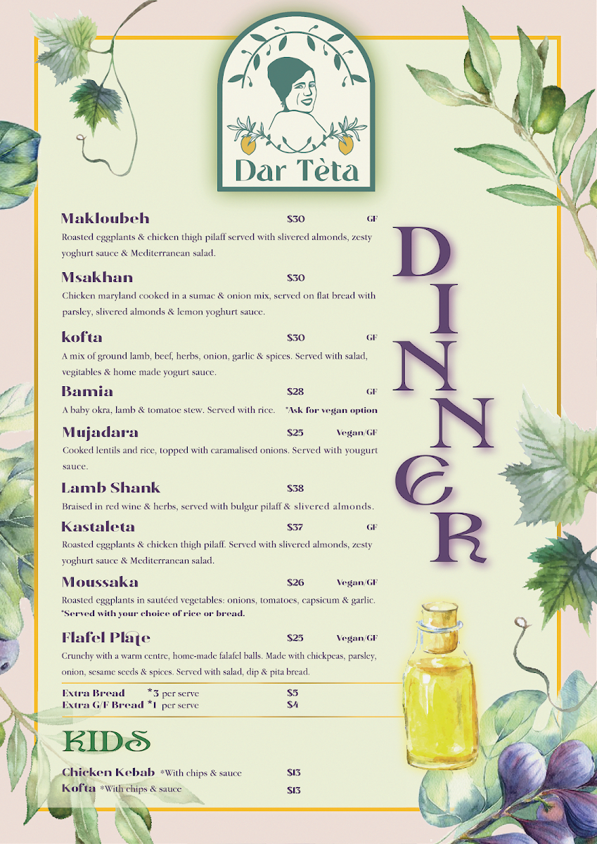 Welcome to **Dar Teta Cafe**, an inviting gem nestled at 136 Murray St, Colac VIC. This cozy café serves a menu brimming with authentic Middle Eastern flavors that will transport your taste buds. Starting with their entrees, indulge in the delightful Malfof—hand-rolled cabbage rolls featuring a savory mix of rice and beef mince, served with a garlic yogurt sauce. For a vegetarian option, try the Warak Inab, vine leaves stuffed with a fresh herb mixture, accompanied by your choice of dipping sauce.